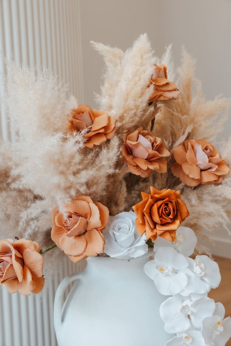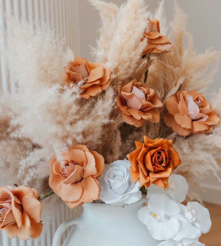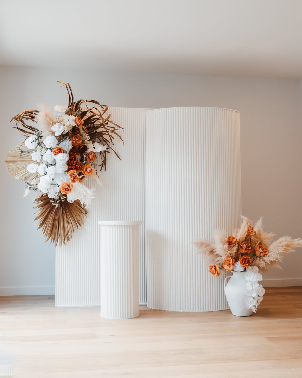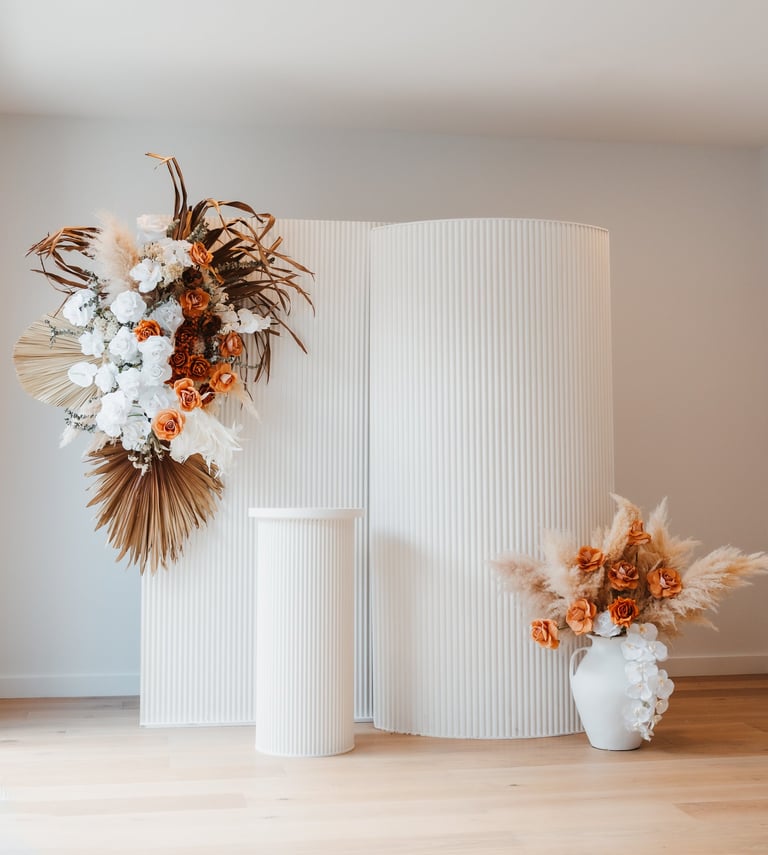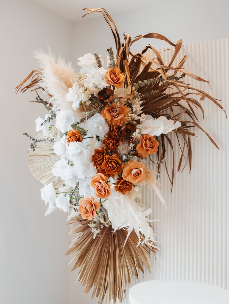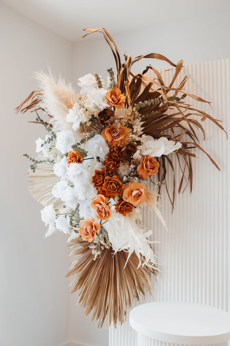 Classy, organic, whimsical and rustic! This boho set comes with dried florals, dramatic dried palm leaves, terracotta and other earthy tone flowers, a big pot of pampas and reflexed silk roses, 2x backdrops, a cake plinth, and lots of bohemian vibes.