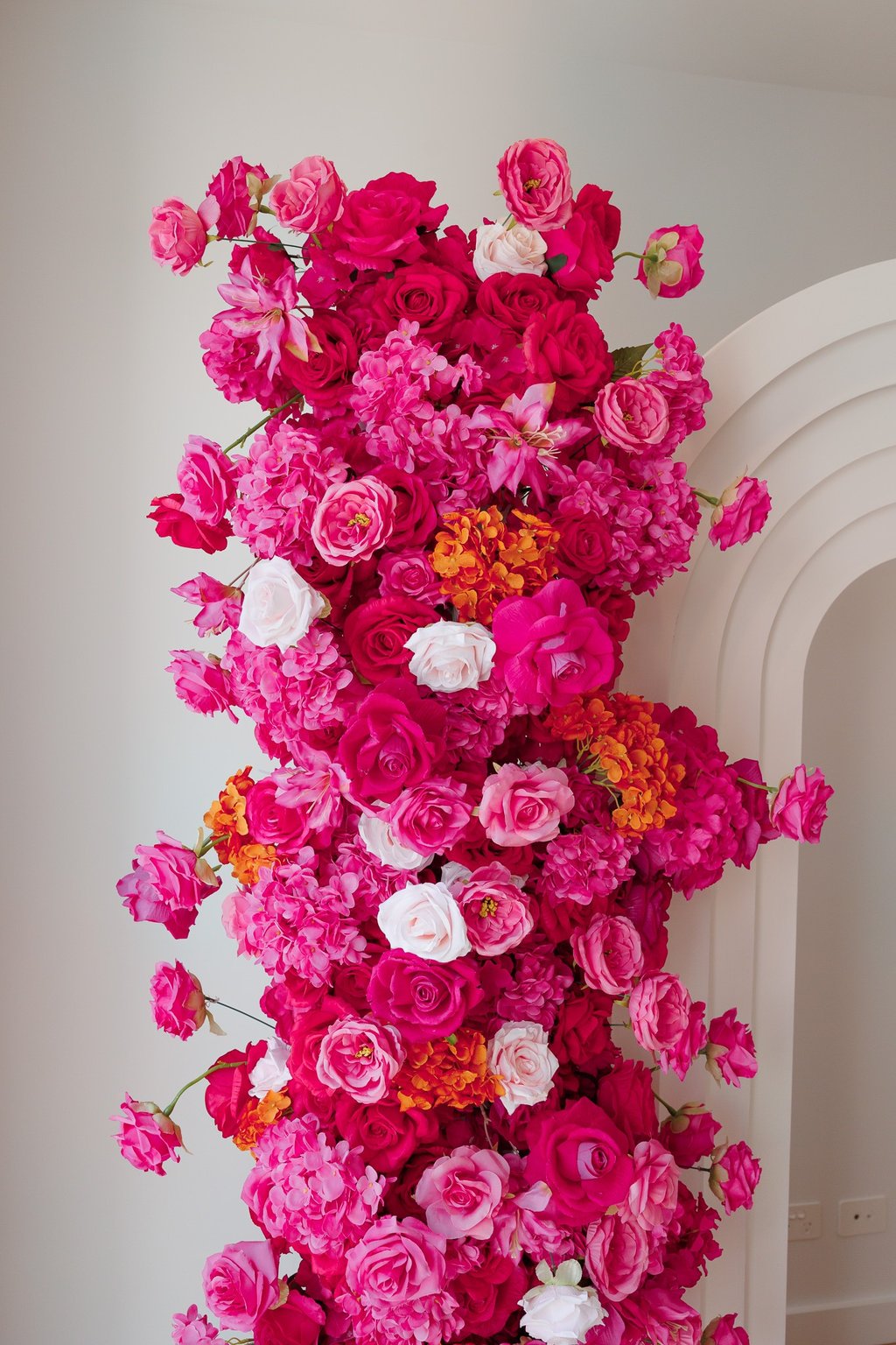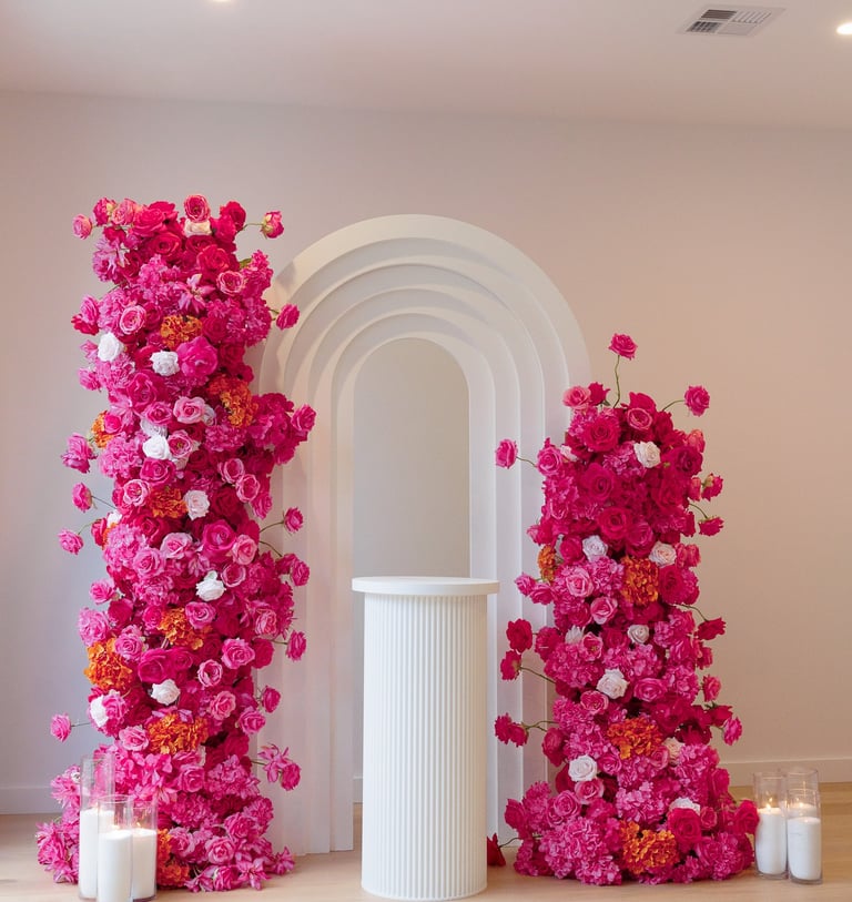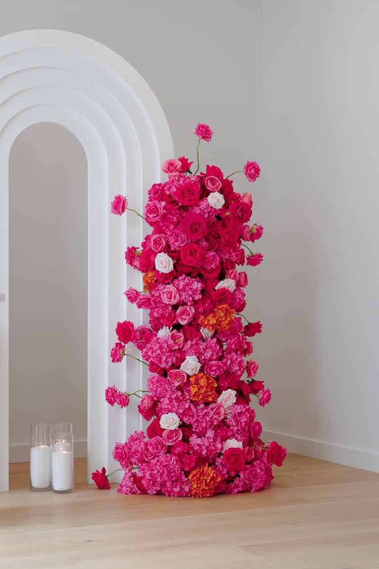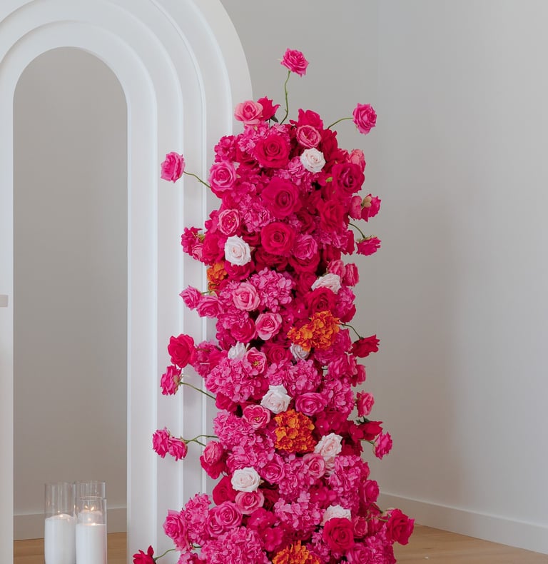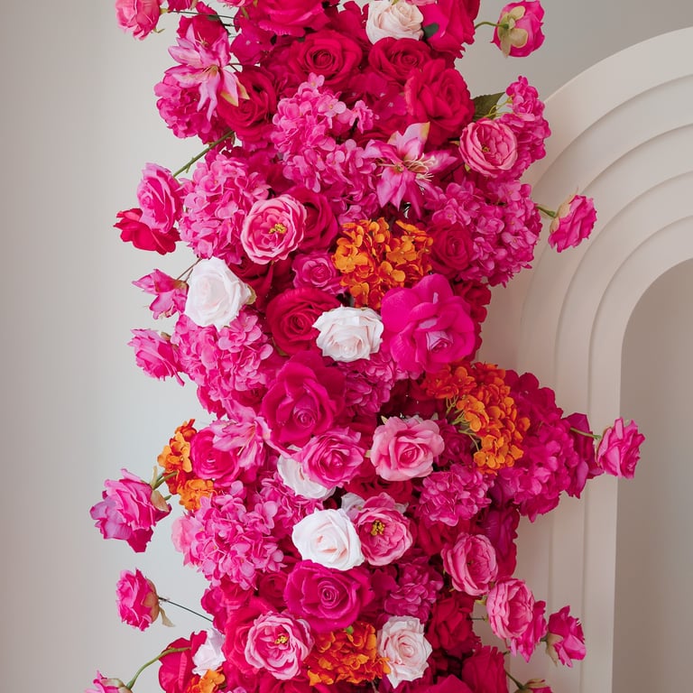 There is a certain confidence that comes with this setup. Amaryllis is a lovely bright pink set with hints of light pink roses and orange. This 2.2metre and 1.6metre floral cascade comes with 2 sets of backdrops (ripple and 5D) customised signage/name, ripple cake stand/plinth and eco friendly candles. It's just perfect for bridal and baby showers, engagements and more!