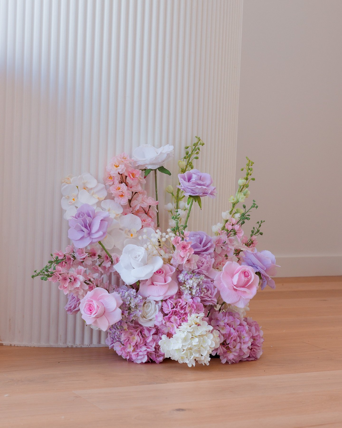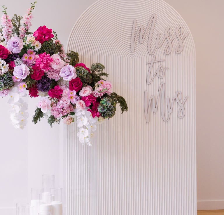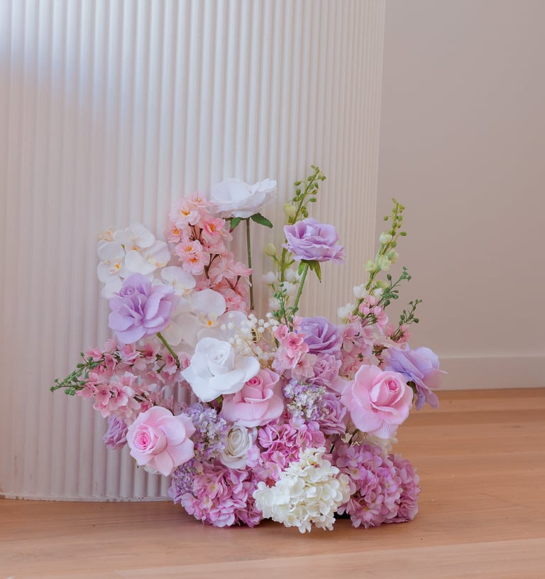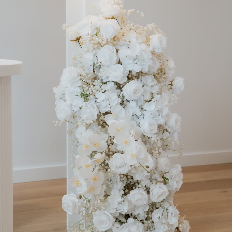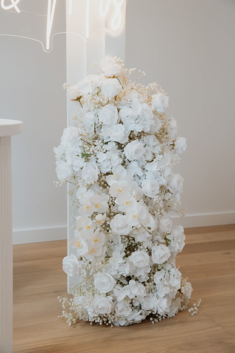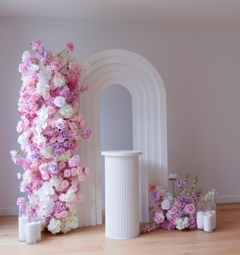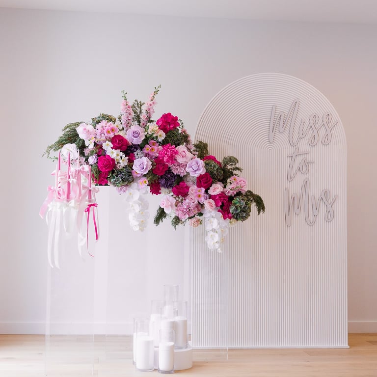 Let's just take a moment to appreciate colour. This set is soft, it's bold, it's safe and it's classy! Astrid is a playful set with light tones of pinks, lilacs and whites and creams. It includes a 2.2metre tall of luxurious floral cascade, a floral piece on the floor, 5D backdrop, customised signage/name, cake stand/plinth and candles to finish it off.