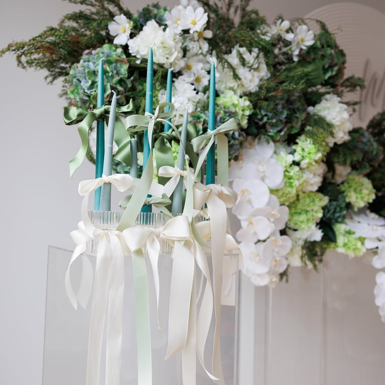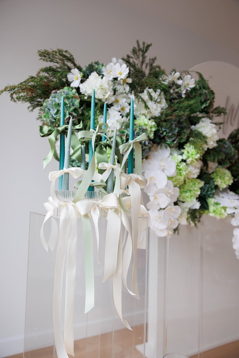 Opt for the vibrant mix of bright pink and lilac with green, or if you prefer a more classic look like me, go for the beautiful earthy tones for your upcoming event. This stunning set includes 3 plinths of varying heights, personalized signage/names, acrylic risers, eco-friendly taper and sand candles, a selection of ribbons and a ripple backdrop. Ideal for engagement parties and bridal showers.